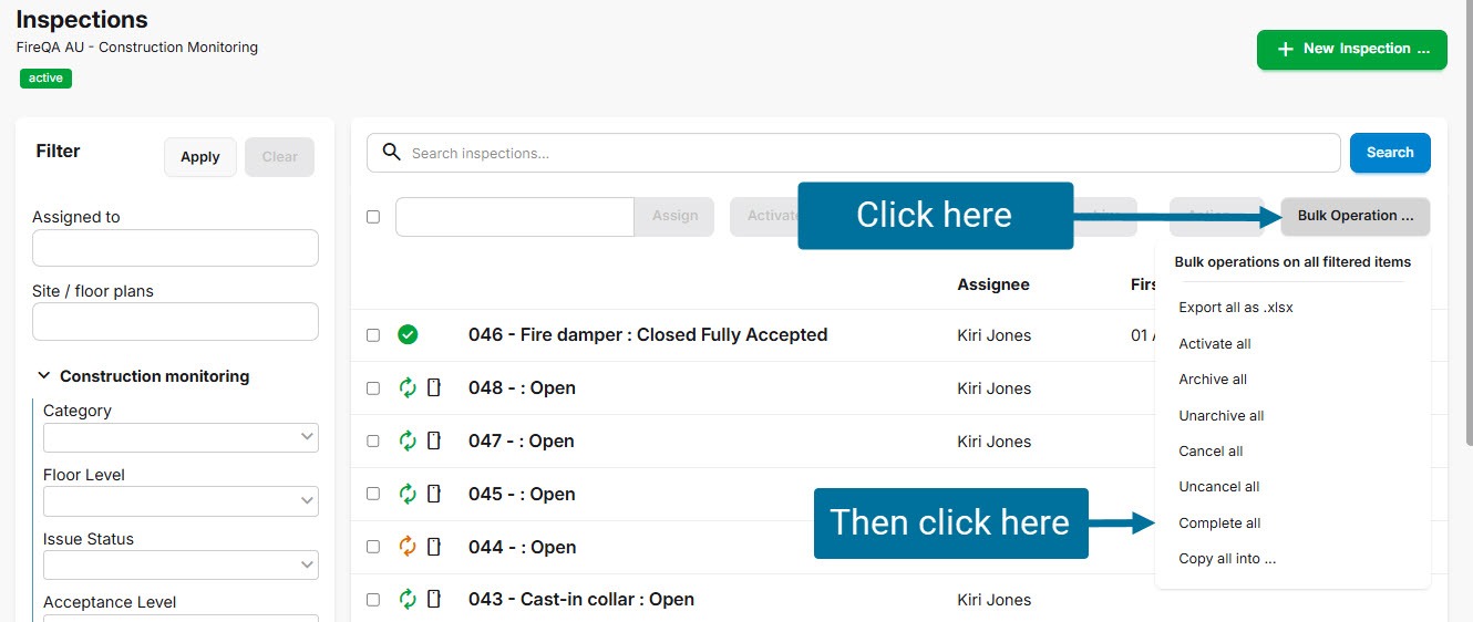 NOTE: If there is more than one inspection type you will need to filter down to a single inspection type to action all.