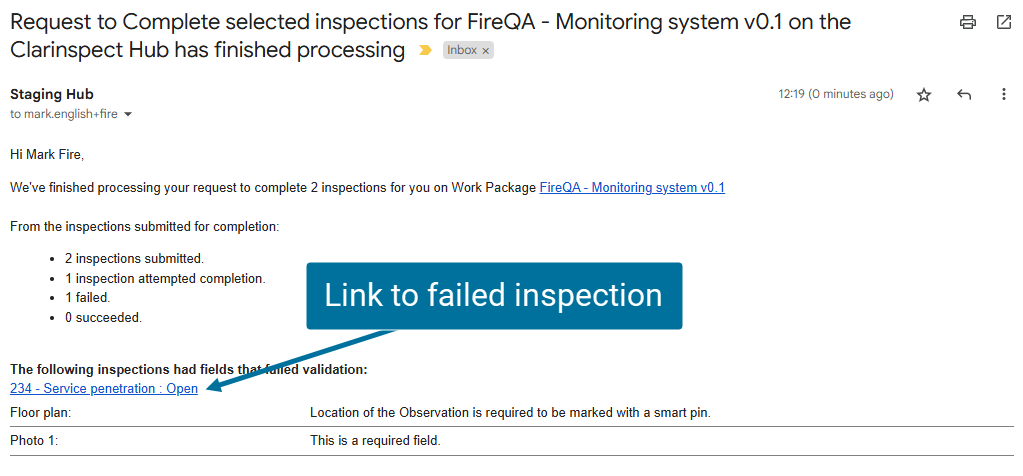 The email you receive will give you a break down of the inspections that were and weren’t able to have the action completed, along with the reasons why, and a link to the failed inspection..