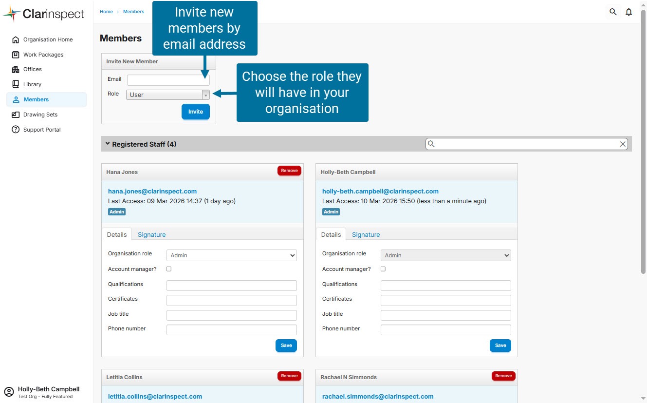 This screen allows you to invite new members and choose their role. The staff roles are Admin, User, and Assessor. If you have an external (read only) account you want to add - use the Monitor role.