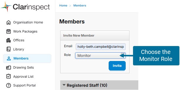 Invite them as you would a new member of staff, but choose the 'Monitor' Role and direct them to this useful guide on Using Clarinspect to Monitor a Project.