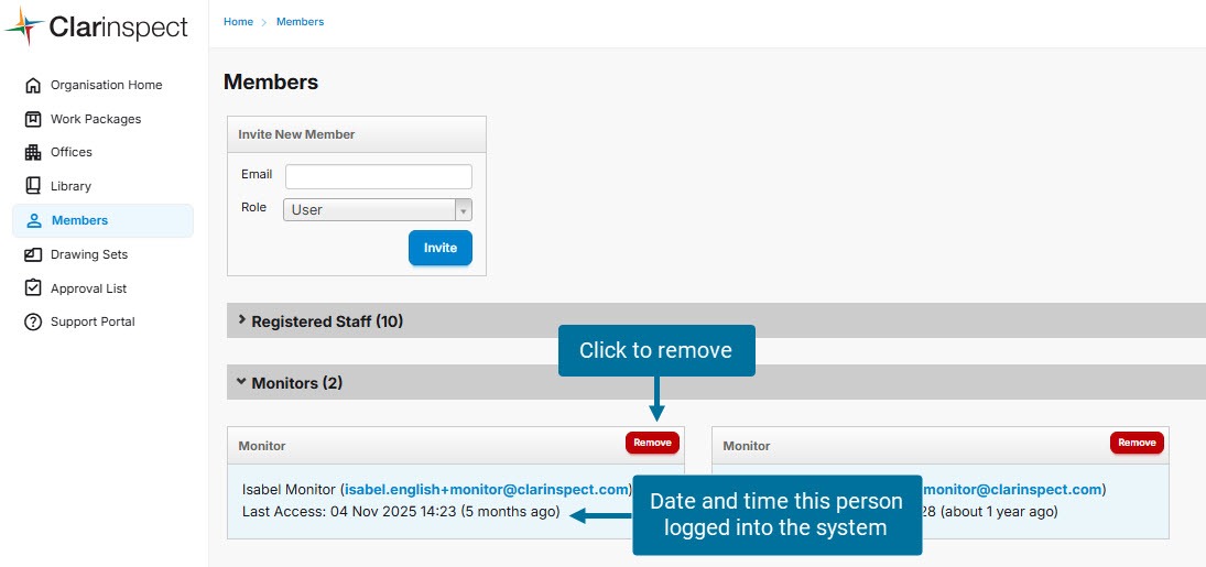 Monitors are users of Clarinspect that only have the rights to view specific Workpackages, and Live work in those Workpackages (i.e. Draft, Active, Finished), but not cancelled or archived.