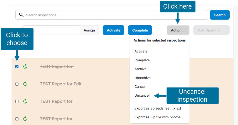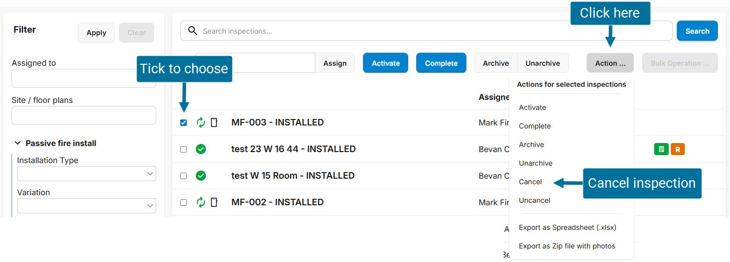 Inspections must be live and either draft or active to be cancelled