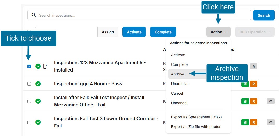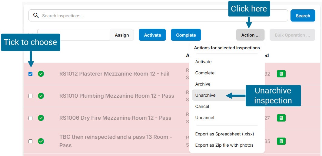 Archiving can only be done from the hub, and only Finished inspections can be archived. Tick to select the inspection(s) you wish to archive. Click ‘Archive’.