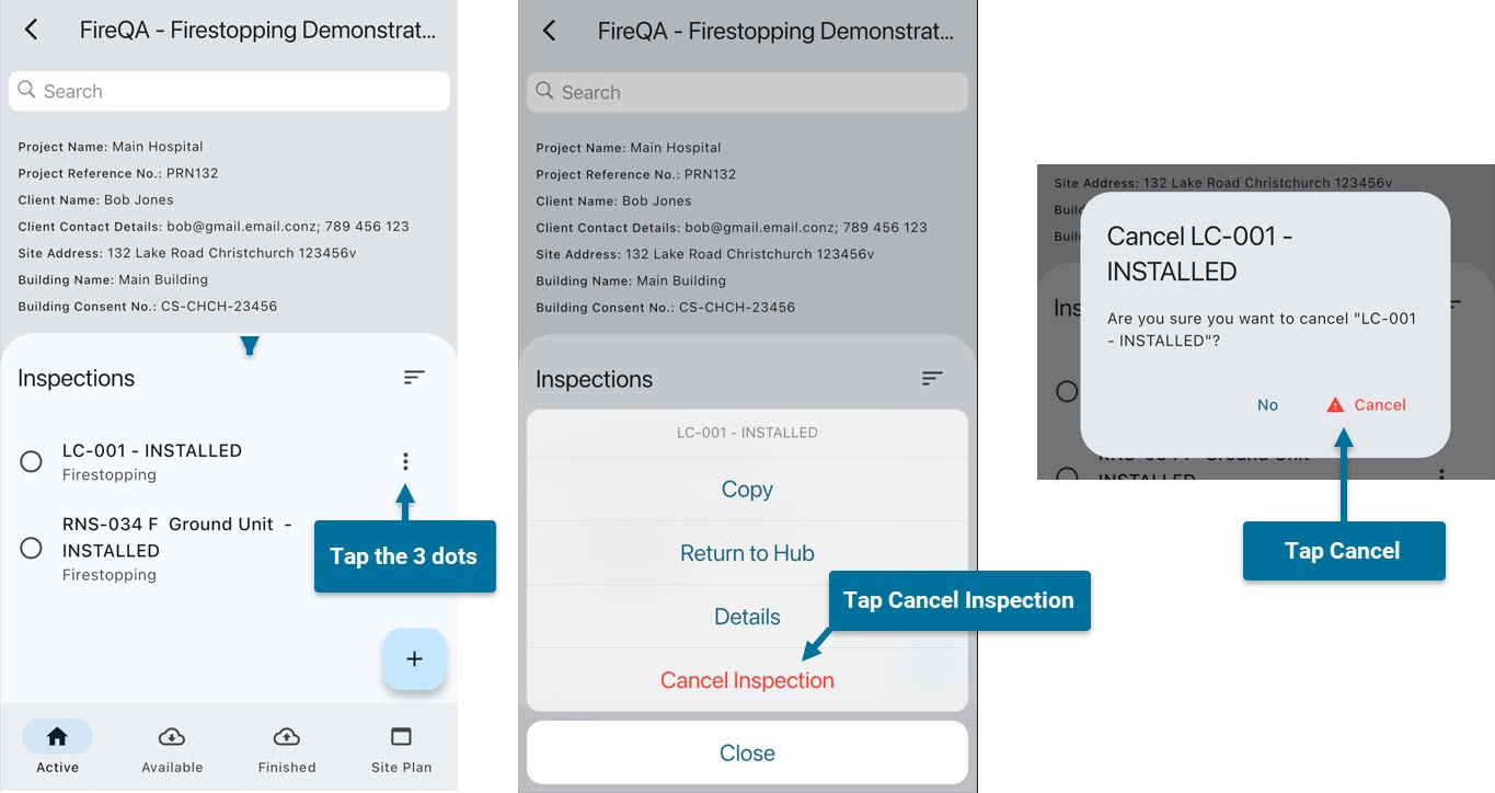 On iOS you can cancel an inspection from the Inspections list. Tap the 3 dots beside the inspection you want to cancel. Select ‘Cancel Inspection’. You will see a warning message pop up. Then click ‘Cancel’.