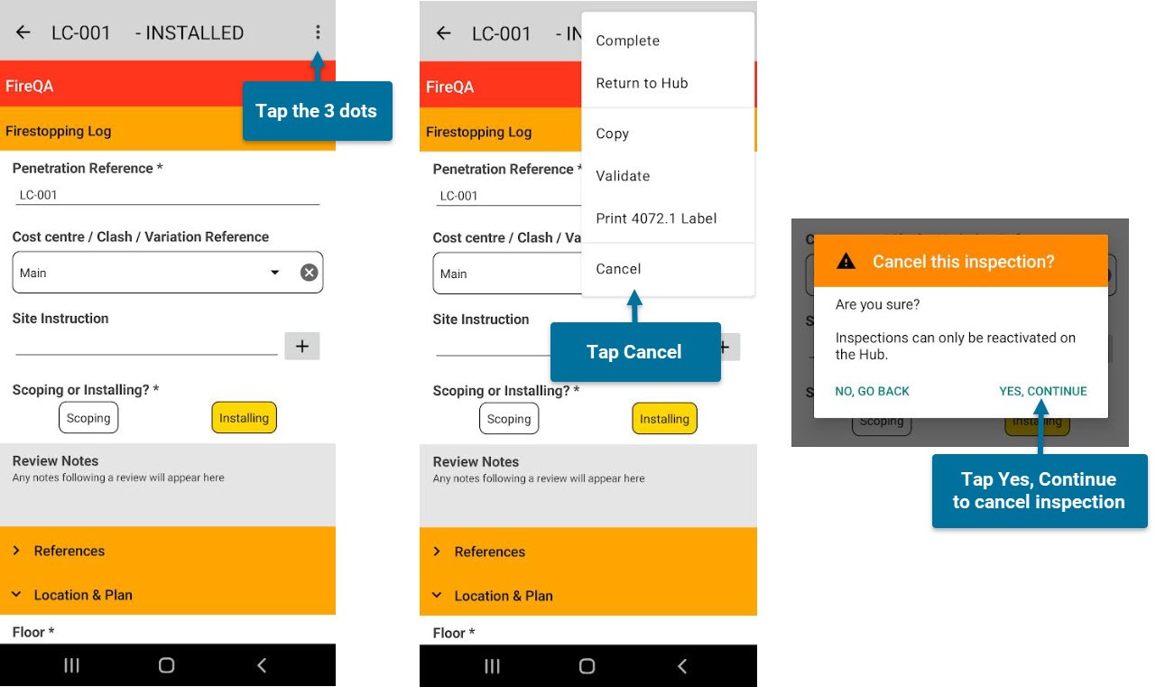 If you want to cancel an inspection on the app, first open the inspection. Then tap the 3 dots at the top, and select ‘Cancel’. You will see a warning message pop up. Click ‘Yes, Continue’ to cancel the inspection.