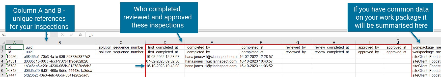 To get the headers, create a dummy inspection in the Hub of the type you want to load, then export it as xlsx. (For more information on how to export data please read Exporting Data from the Hub).