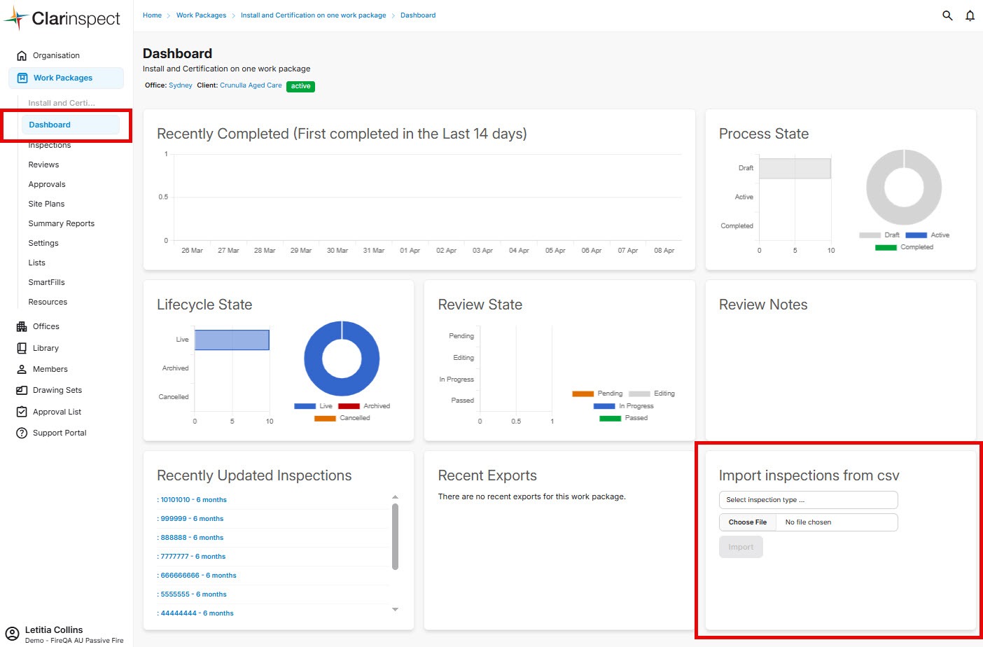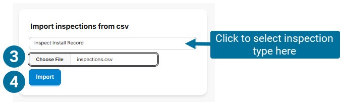 Now choose the file to import, go to the “Import inspections from csv”. This is located in the Dashboard as shown below.