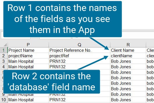 When you open this you will see two two rows of headers - one for humans to read and one for computers. Row 2 are the field names the software uses.