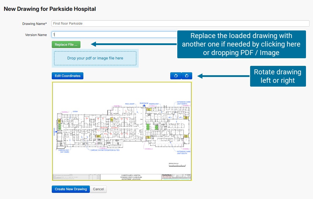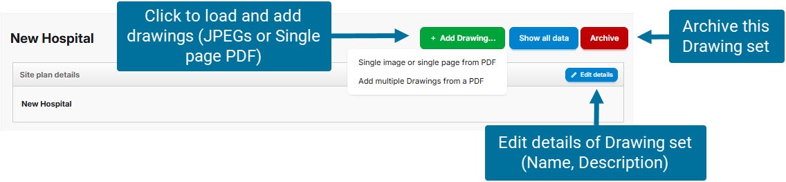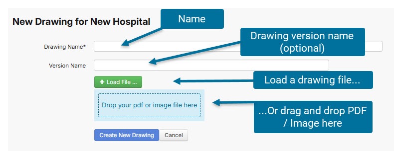 Click on 'Add Drawing'. Give the drawing a name and (optionally) a version name (this may be the drawing revision number e.g. A2).
