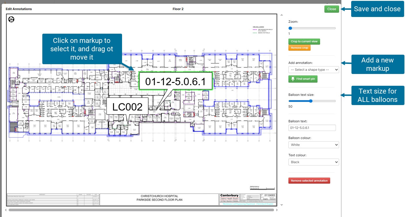 Select from the add annotation dropdown. A new markup will be placed on the background and selected, ready for you to edit and move it to suit.