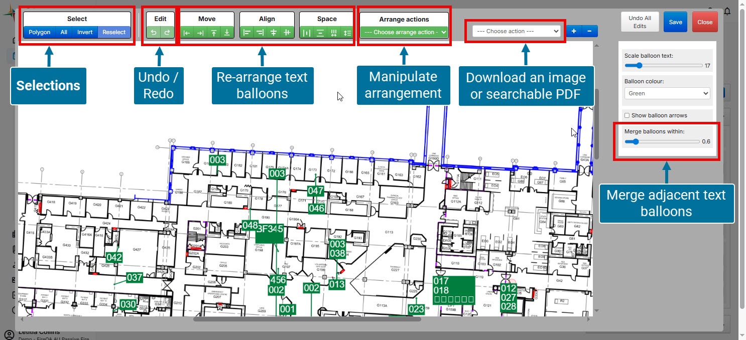 There are new features available to Organisation Admins, Work Package Managers and Users to allow them to rearrange the text balloons as a group, or to select a specific group of balloons, and save the arrangement