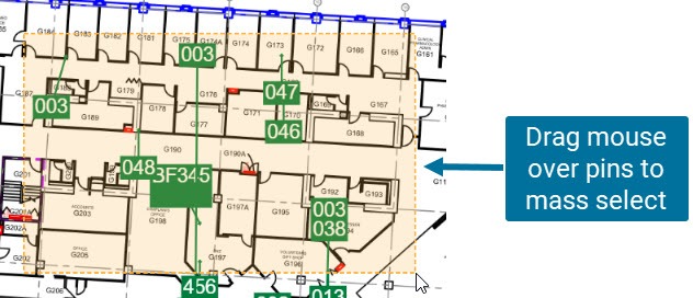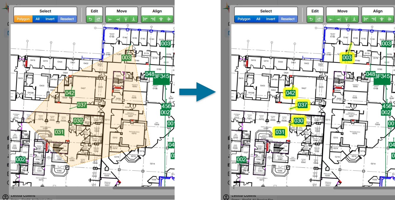 Polygon - You can select the points inside an odd shaped area by clicking on the plan to create a shaded polygon. When you have the desired shape, double click and you will select all Text Balloons inside that area.