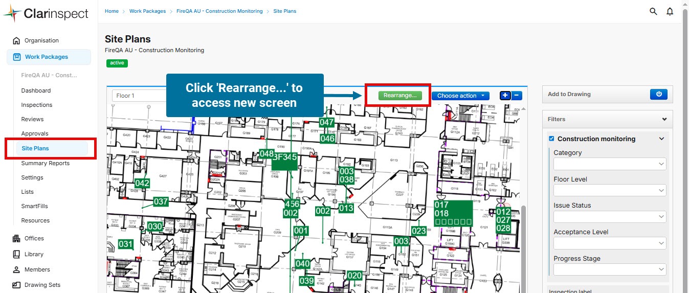 When viewing the Drawings on Work Package, click the 'Rearrange...' button to access the tools.
