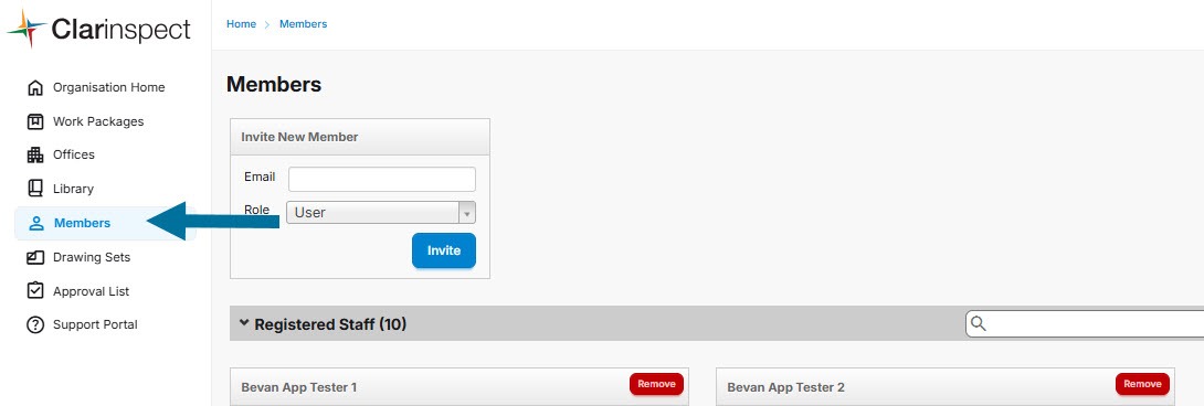 Start by opening the Members screen. Any images displayed are representative only and may differ depending on the system and version installed. This screen allows you to invite new members and choose their role. The staff roles are Admin, User, and ...