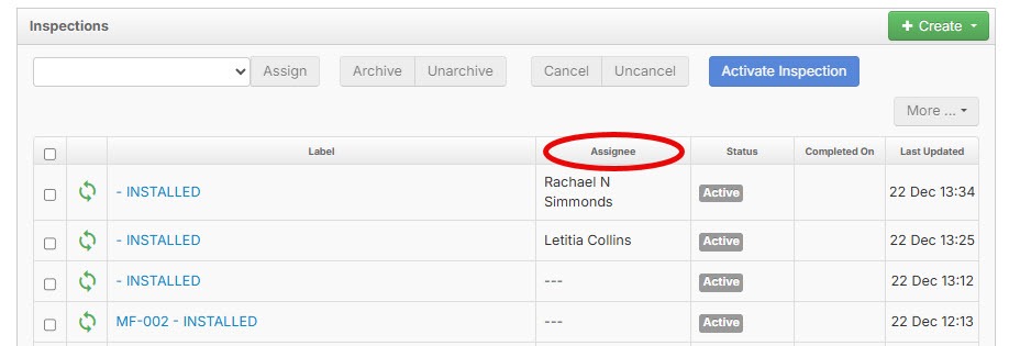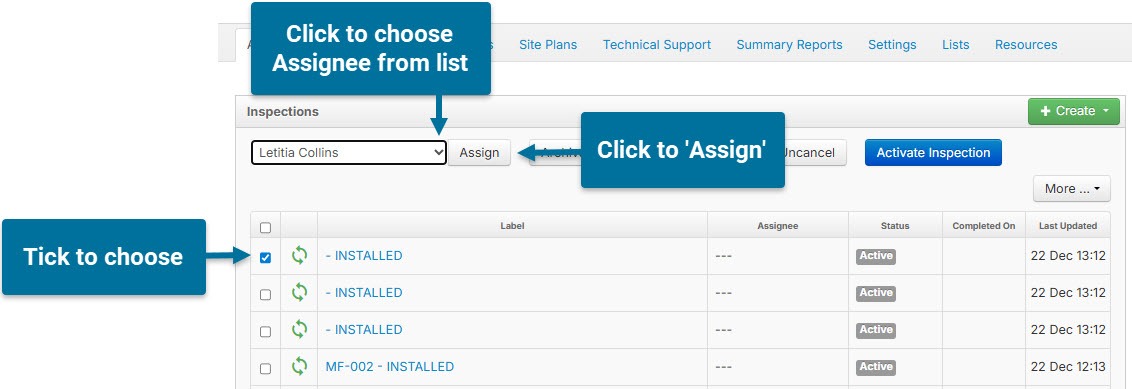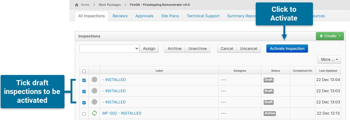 To activate, tick inspection(s), then click the blue ‘Activate Inspection’ button. Status will then change from Draft to Active.