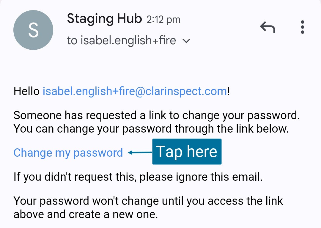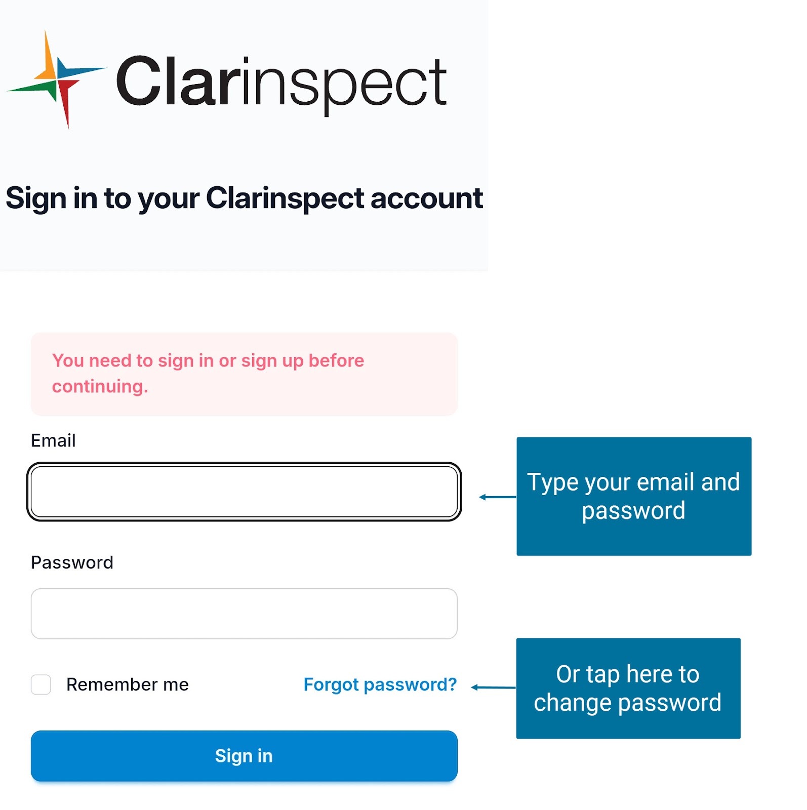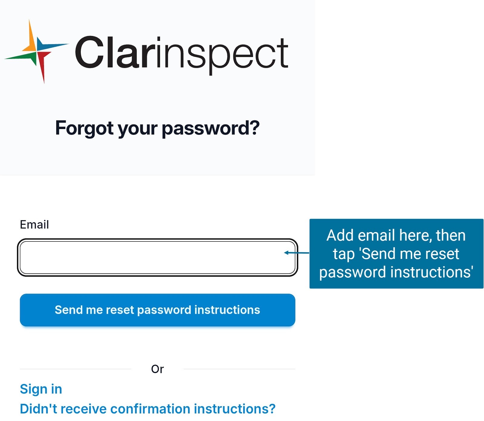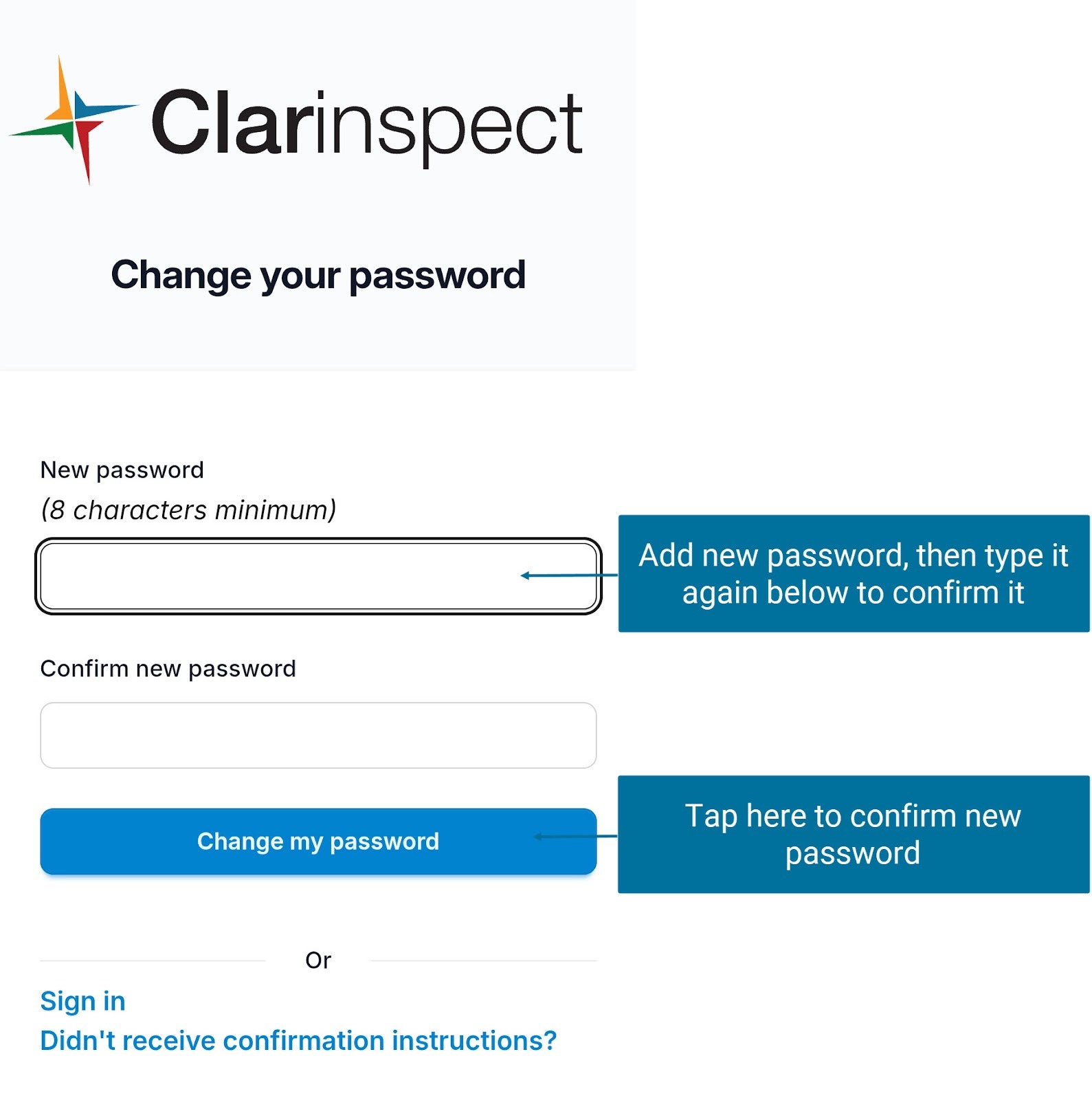 The link will take you to the Clarinspect app ‘Change your password’ page. Type in the new password you want to use, then type in again to confirm.
