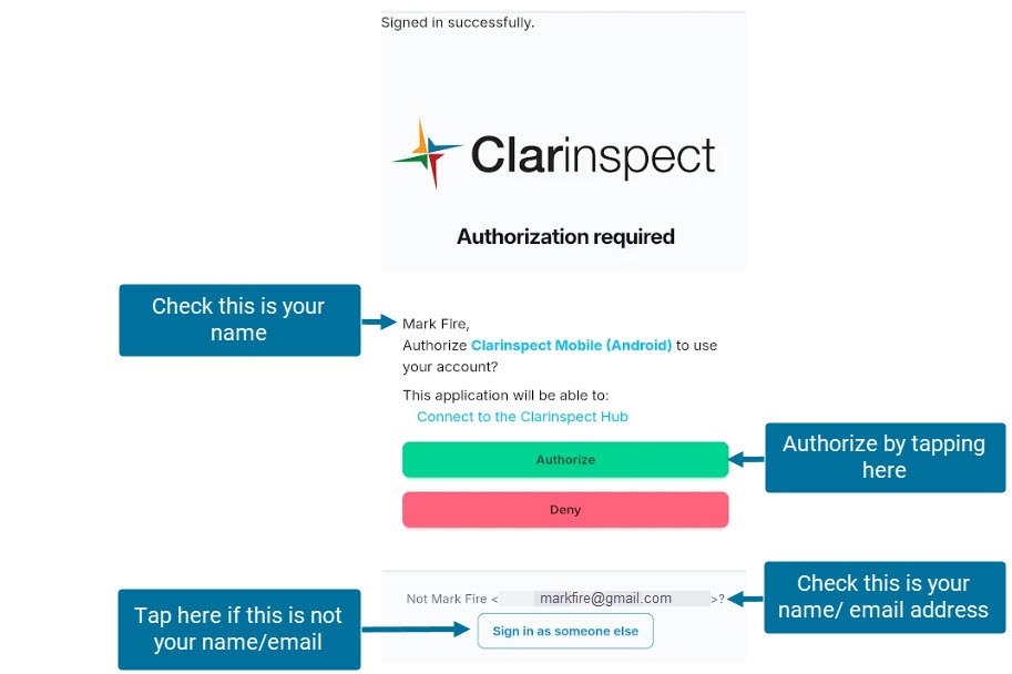 As outlined in the Authorising section of this guide, it is important to check that your name and email are a match, and if not, to click ‘Sign in as someone else’..