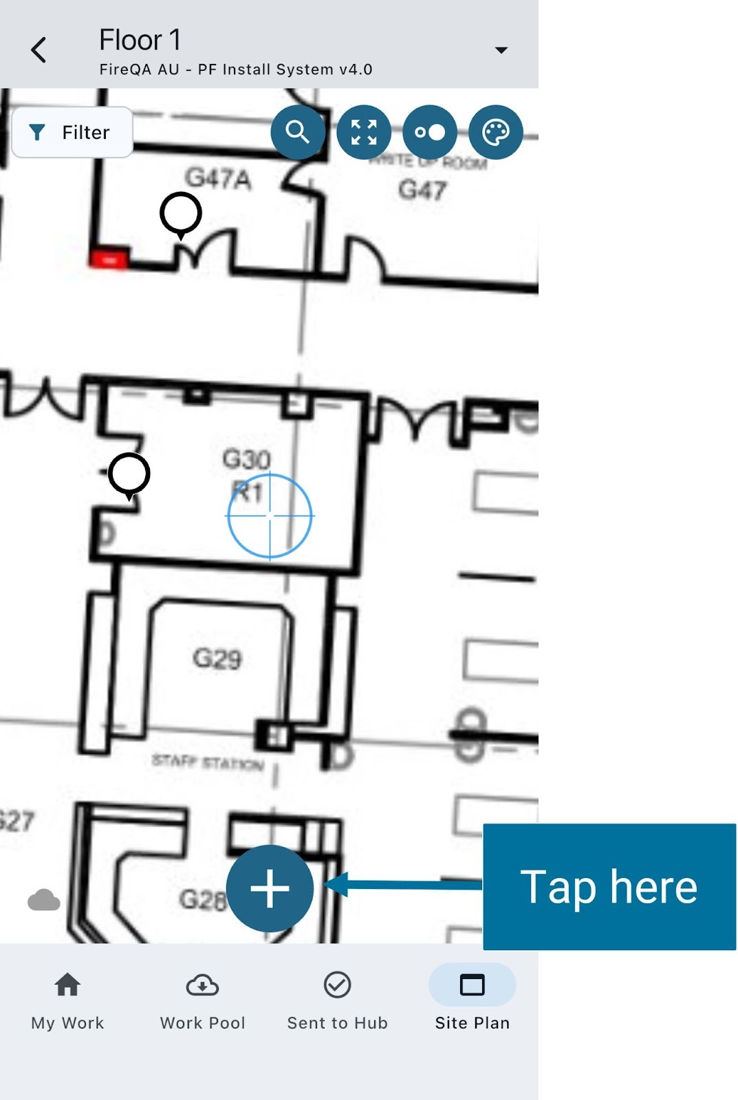 Like the Android app, you can also add SmartFills via the Site Plan. To do this, go into the Site Plan section of the app. Make sure you zoom in until the ‘+’ appears. Then, tap on the ‘+’ to create a new inspection.
