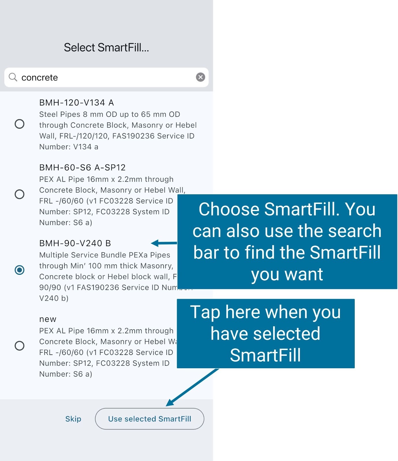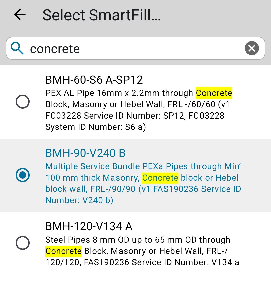You can use the search bar to find SmartFills. For example, you can search ‘Concrete’ and each SmartFill that has ‘Concrete’ in its label/ Description will be highlighted yellow.