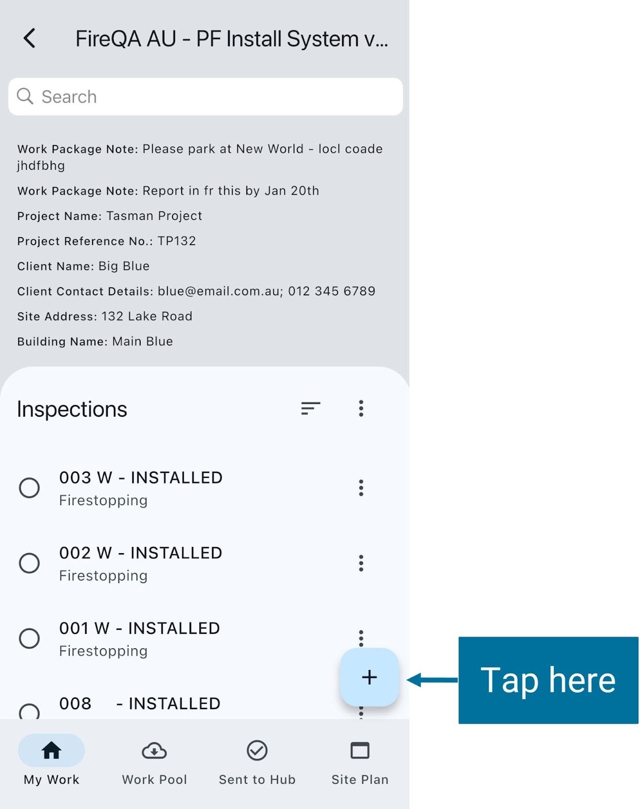 To add a SmartFill in an inspection, firstly tap the ‘+’ to create a new inspection from the inspection list.